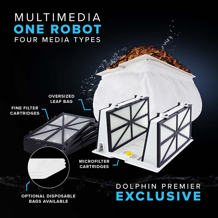 - Multiple filter options for an optimal clean pool. The Premier comes standard with three filter options: bottom-load fine cartridge filters, ultra-fine cartridge filters, and an oversized fine filter bag. The most filters in a Dolphin cleaner ever.